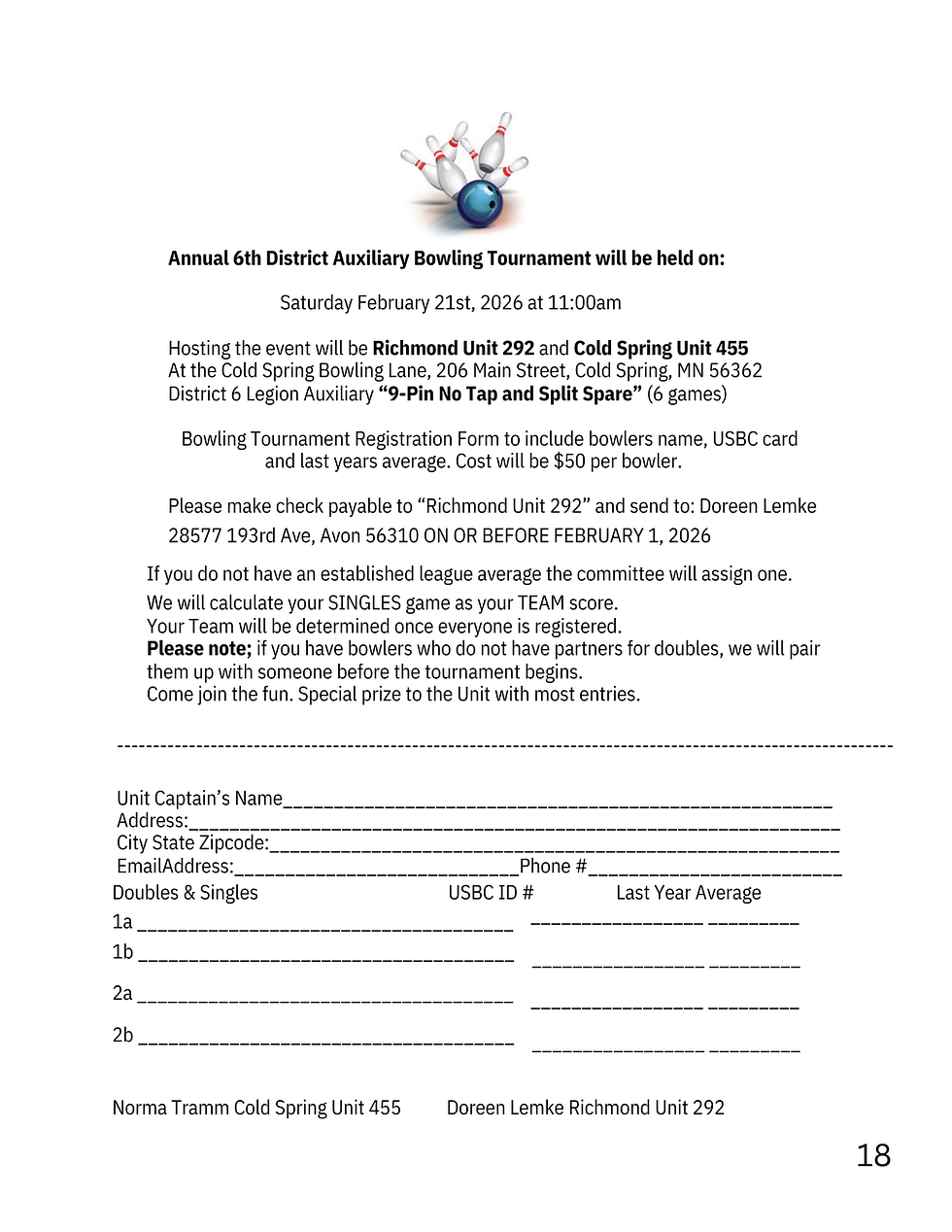 Today is the deadline to register for the Annual 6th District Auxiliary Bowling Tournament -Hosted by Cold Spring Unit 455 & Richmond Unit 292. Cost is $50 per bowler.